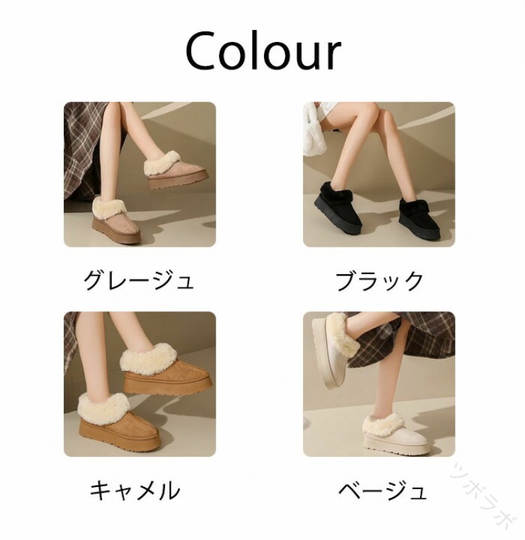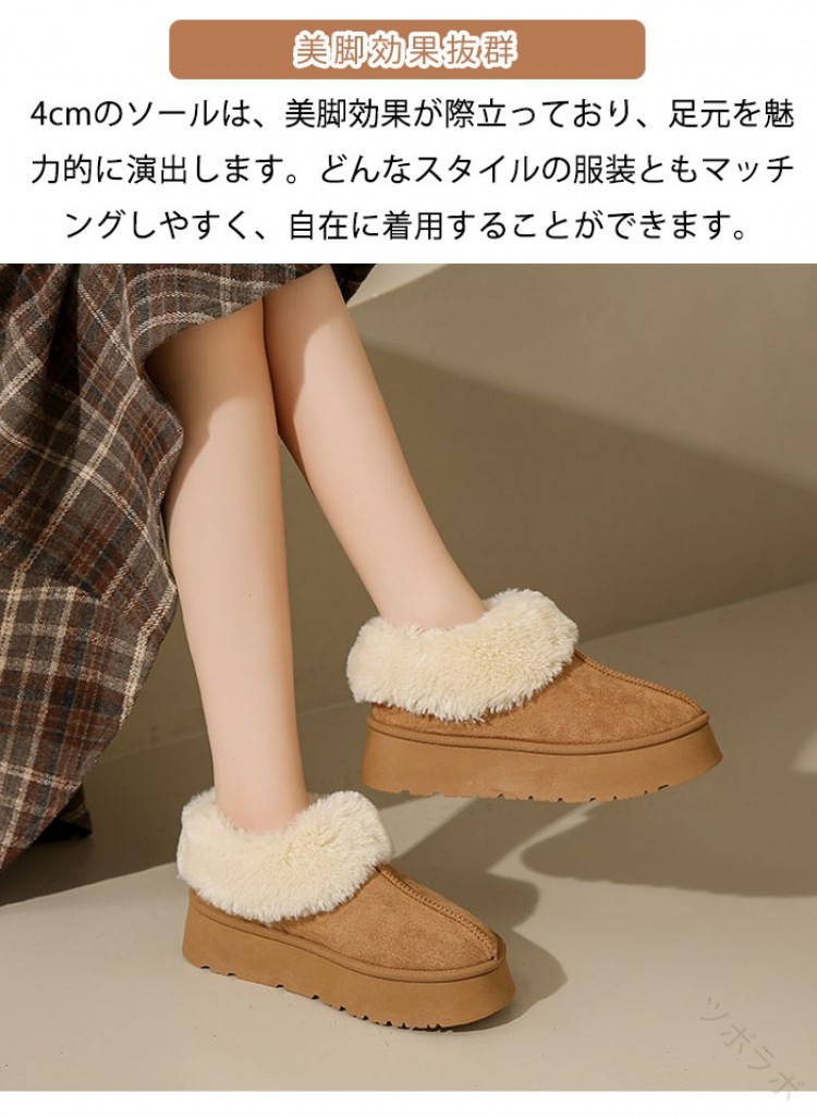 【商品紹介】商品名:ムートンブーツ レディース ムートンシューズ 厚底 4cmヒール スリッポン フ ルームシューズ フェイクファー もこもこ 厚底靴 裏ボア 裏起毛 厚手 防寒対策 保温 あったか 歩きやすい 柔らかい 疲れない おしゃれ 秋冬 アウトドア 室内 室外 女性 大人【商品説明】ムートンブーツ レディースは、秋冬の寒さ対策に最適な一足です。厚底4cmヒールでスタイルアップしつつ、スリッポンタイプで履きやすさも抜群。裏ボアと裏起毛が足元をしっかり保温し、もこもこのフェイクファーが見た目にも暖かさを演出します。柔らかい素材で長時間歩いても疲れにくく、室内外問わず活躍します。おしゃれで機能的なこのブーツは、大人の女性にぴったりのアイテムです。【スペック】商品名:レディースブーツアッパー:フェイクファーソール:ゴム【Color】グレージュ、ブラック、キャメル、ベージュ【注意事項】生産ロット、入荷時期により柄や色の濃い薄い等、異なる場合が御座います。カラーにより同じサイズでも2~3cm誤差が生じる場合がございます。海外製品のため縫製品質が日本とは異なり、縫製が雑、糸の始末ができていない場合もございますので予め御了承ください。使用時の破損や事故等につきましては責任を負いかねます。輸入品の為、輸送の際に生じるキズ汚れ箱潰れがある場合がございますが新品です。あくまで画像はイメージですので、商品改良の為パッケージや一部仕様が少し変更になる場合もございます。会社概要お買い物ガイドに他にも詳しく記載しておりますので事前に確認していただくことをお勧めいたします。商品画像はライトの下で撮影しており、ご覧いただくモニター等の違いで画像と実商品の色合いが若干異なる場合がございますので、予めご了承下さい。測定したサイズは素人採寸のため、1~3cm程度の誤差が生じる場合があります。ご使用のパソコン環境により、商品画像と実際の商品の色味とが多少異なって見える場合がございます。販売価格を抑えるため弊社では簡易包装での発送となります。あらかじめご了承ください。【原産国】中国(日本の企画により厳格に生産されています。)【商品安心保証】初期不良の場合は返品返金交換対応させていただきます。商品到着より7日以内に、弊社までご連絡いただきますようお願いいたします。お使用方法がわからない等、何かお困りの問題、ご不明な点がありましたら解決策をご案内します。お気軽にメ一ルでご連絡くださいませ。以上の内容を十分にご理解いただきました上でご注文をお願いいたします