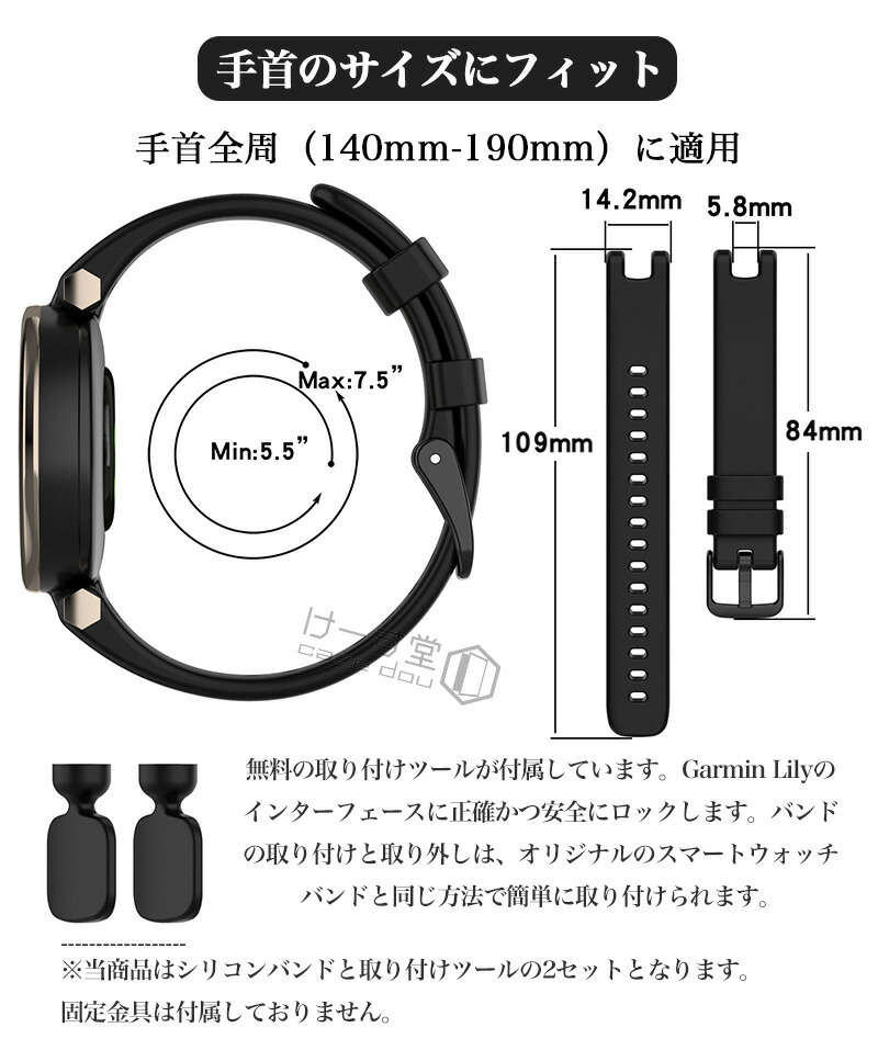 • 無料の取り付けツールが付属しています。Garmin Lilyのインターフェースに正確かつ安全にロックします。バンドの取り付けと取り外しは、オリジナルのスマートウォッチバンドと同じ方法で簡単に取り付けられます。
