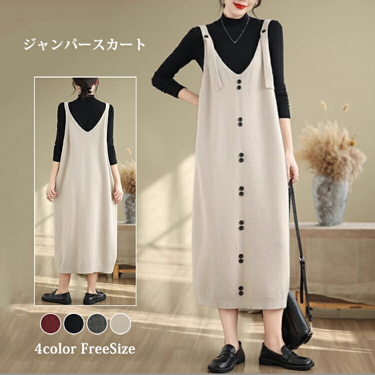 「新品10%」 春秋に着たくなるトレンドワンピ♪ 重ね着で褒められ着回し上手◎ ニット サロペット ジャンパースカート レディース ロング丈 ネック ワンピース