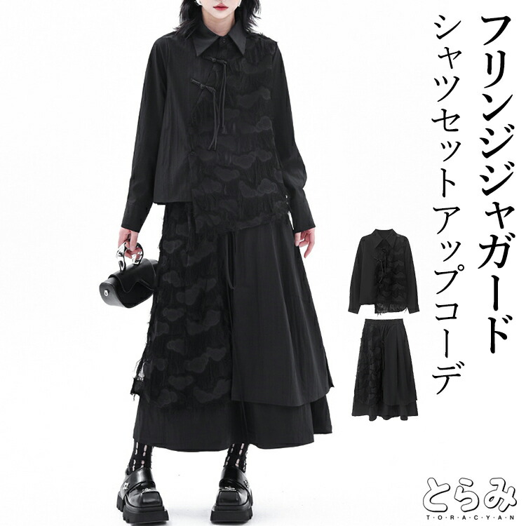 フリンジジャガード セットアップ シャツ 長袖 チャイナボタン スカート ロング ハイデザイン デザインセットアップ ゆったり シンプル モード 体型カバー 着痩せ 大きめ