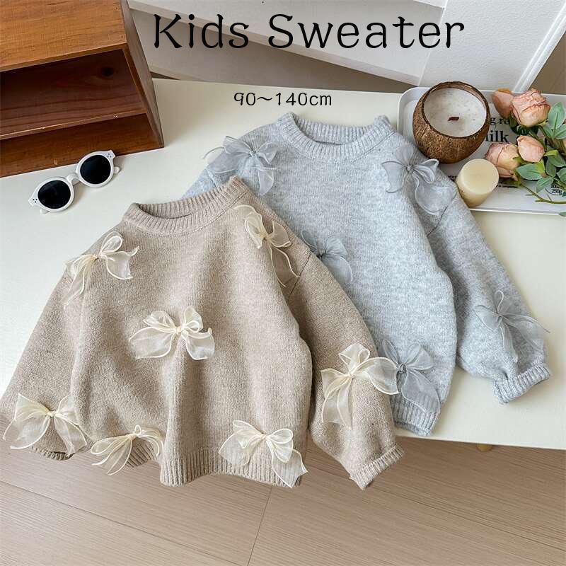 リボン付きニット セーター キッズ 無地 子供服 男の子 女の子 スクールセーター 洗える トップス 長袖 おしゃれ 可愛い ジュニア 赤ちゃん 春秋冬 暖かい 誕生日 プレゼント 入園 クリスマス