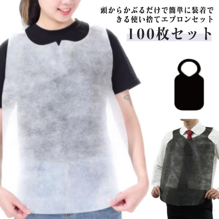 使い捨てエプロン 介護用 大人用 紙エプロン 100枚セット 食事用 不織布 子ども用 汚れ防止 袖なし 前掛け ブラック ホワイト 業務用 男女兼用 飲食店 焼肉 ラーメン レストラン BB 焼き肉