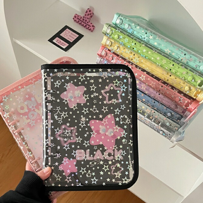 キラキラ輝く シール帳カバー バインダー A7サイズ対応 女の子 はがせるシール収納 ホログラム クリアバインダー 6穴 シール収納 推し活グッズ 手帳 防水 PVC素材 ホログラム星柄 持ち運び便利
