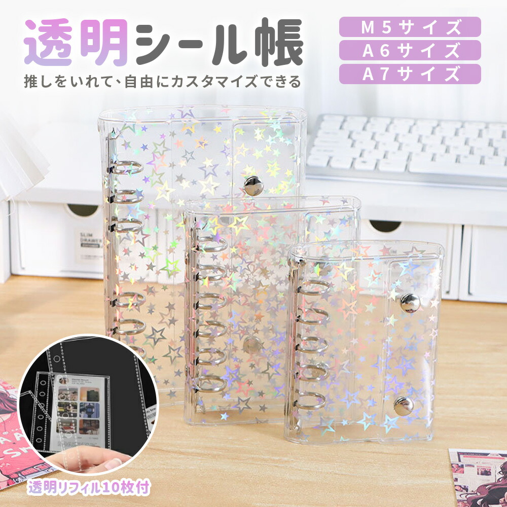 透明シール帳 キラキラ輝く シールバインダーバインダー A5 シール収納 クリアバインダー ミニサイズ 手帳 推し活グッズ リフィル10枚 防水 ホログラム星柄 DIYデ 持ち運び便利
