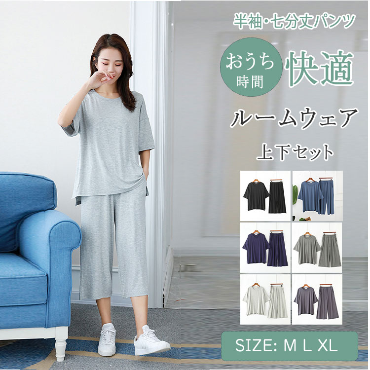 さらっとした肌ざわりのモダール素材使用。半袖クルーネック&七分丈パンツのゆったり上下セットで春夏に最適。通気・吸湿性抜群の快適ルームウェア。