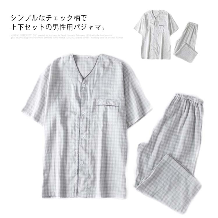 パジャマ メンズ ダブルガーゼ ガーゼパジャマ ルームウェア 綿100% コットン シャツパジャマ 上下セット チェック ギンガムチェック 千鳥柄 部屋着 半袖 襟なし 涼しい ナイトウェア 寝 甚平