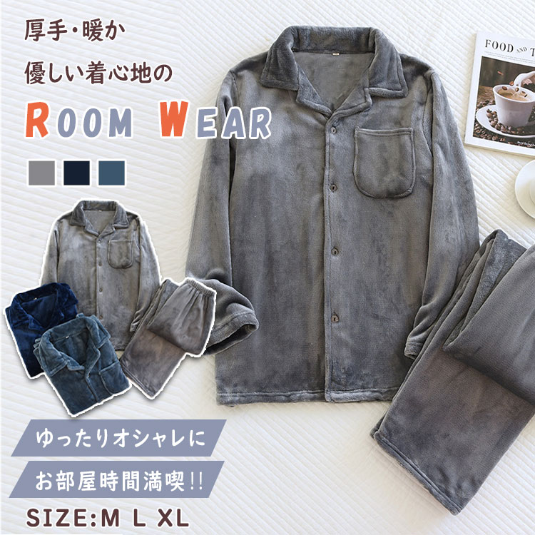 メンズ パジャマ フランネル 上下セット 部屋着 ルームウェア ゆったり 両面起毛 裏起毛 長袖 防寒 暖かい 厚手 衿付き ポケット付き 秋冬服 肌に優しい ふんわり 寝間着 無地