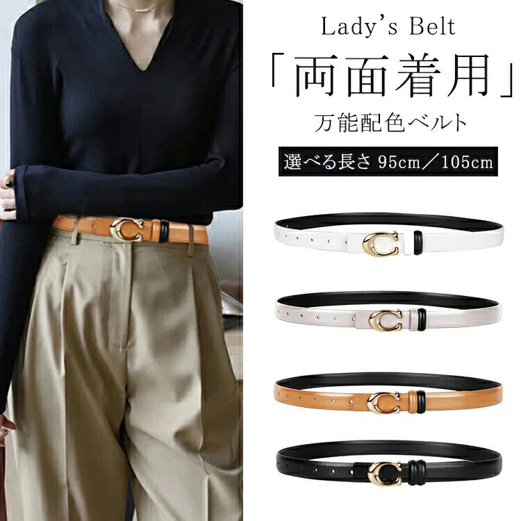 2way 両面着用 ベルト レディース おしゃれ 太めベルト穴調整可能 シンプル PUレザー スリムベルト ゴールドバックル ワンピース用 コート用 フォーマル 通勤 通学 お洒落 ビジネス