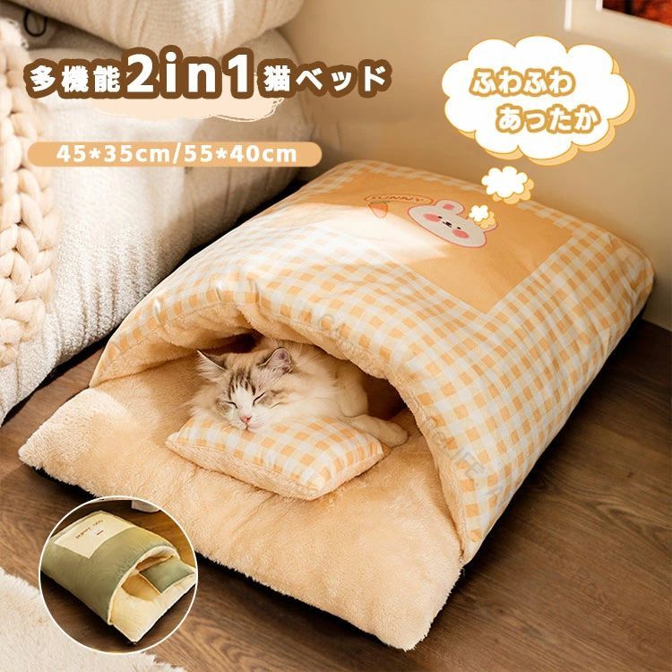 保温性抜群の裏起毛素材使用で冬でも暖かい枕付き猫布団 洗えて清潔 おしゃれでふわふわなペット用ベッド