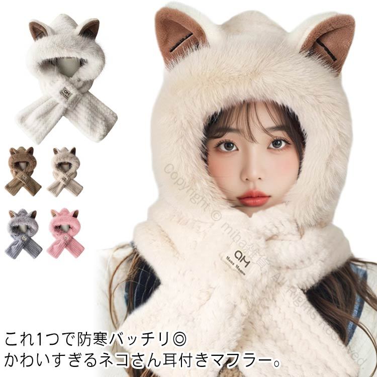 フード付きマフラー ボア帽子 ネックウォーマー レディース ファー ティペット マフラー 一体型 フード付き ネコ 猫耳付き もこもこ キャップ おしゃれ 女の子 ジュニア ふわふわ 厚手 あっ 大人
