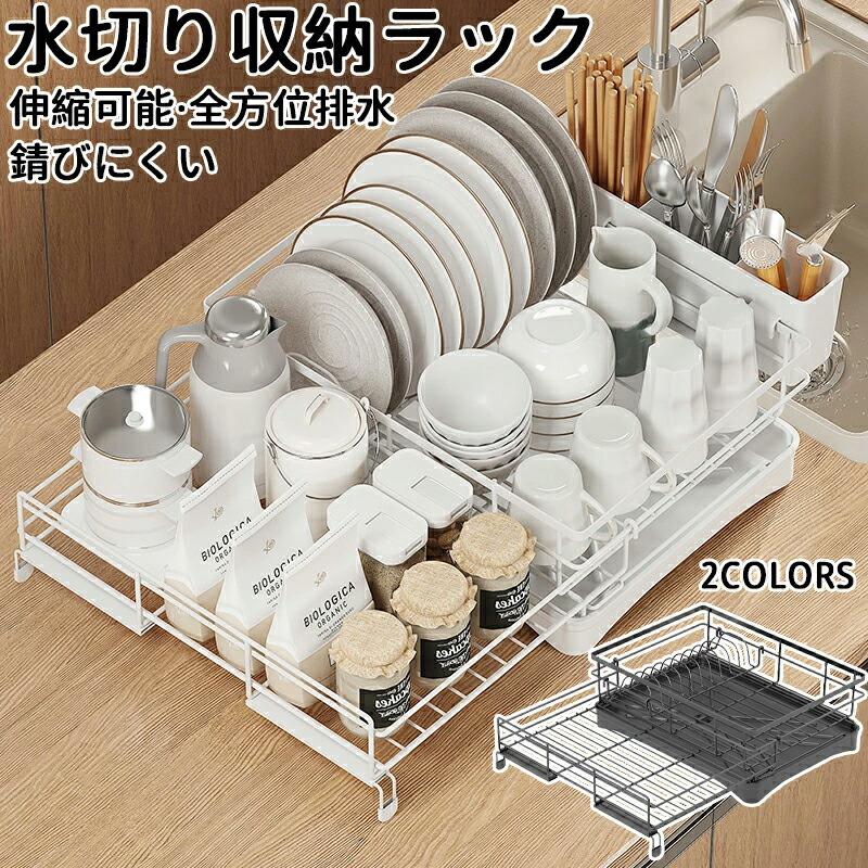 省スペースで収納力抜群!!キッチン 収納 横置 水切りラック 水切りかご ステンレス 大容量 水切り かご ラック 食器水切り 洗い 水切り かご ラック伸縮可能360°排水自動排水
