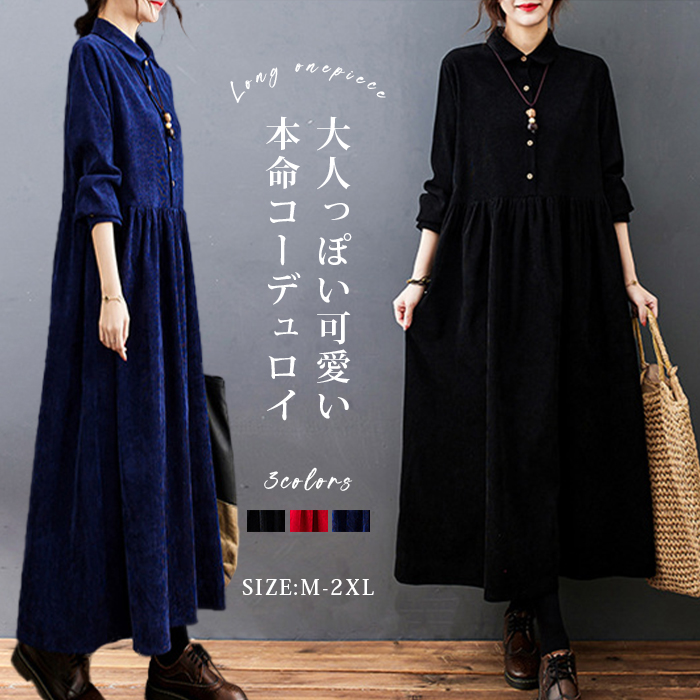 ロングワンピース コーデュロイ レディース ワンピース コーデュロイワンピ 長袖 ロング丈 大きいサイズ 体型カバー ぽわん袖 あったか 暖かい ミモレ ゆったり カジュアル 着痩せ 50代 春 大人