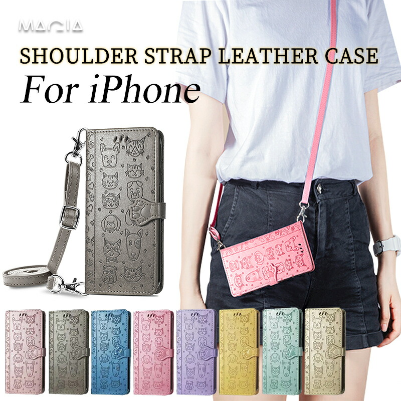 \送料無料/ 17 手帳型ケース アイフォン16 15 14 13 ケース ネックストラップ付き 12 11 スマホケース 肩掛け ショルダー タイプ かわいい ネコ 犬 猫
