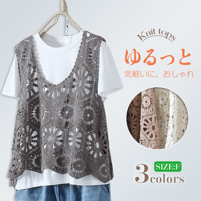 ベスト レディース 夏 トップス 透かし編み プルオーバー Uネック かぎ編み カジュアル 無地 レイヤード クロシェ編み ニットベスト きれいめ フェミニン 大人可愛い 体型カバー 着 ノースリーブ