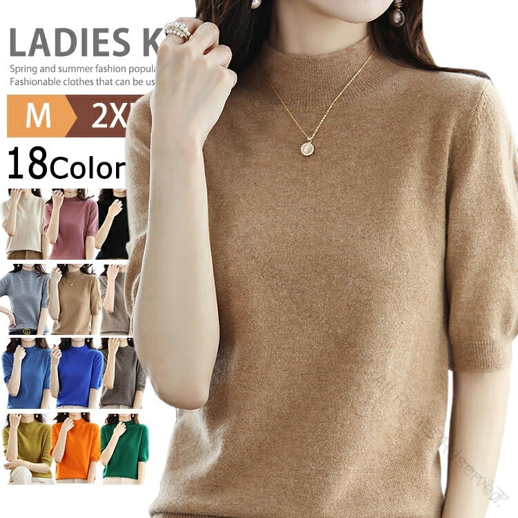 サマーニット レディース 半袖ニット ハイネックtシャツ ニットTシャツ ゴルフウェア 洗えるニット きれいめ オフィス サマーセーター カットソー トップス ビジネス インナー 春夏 無 カジュアル