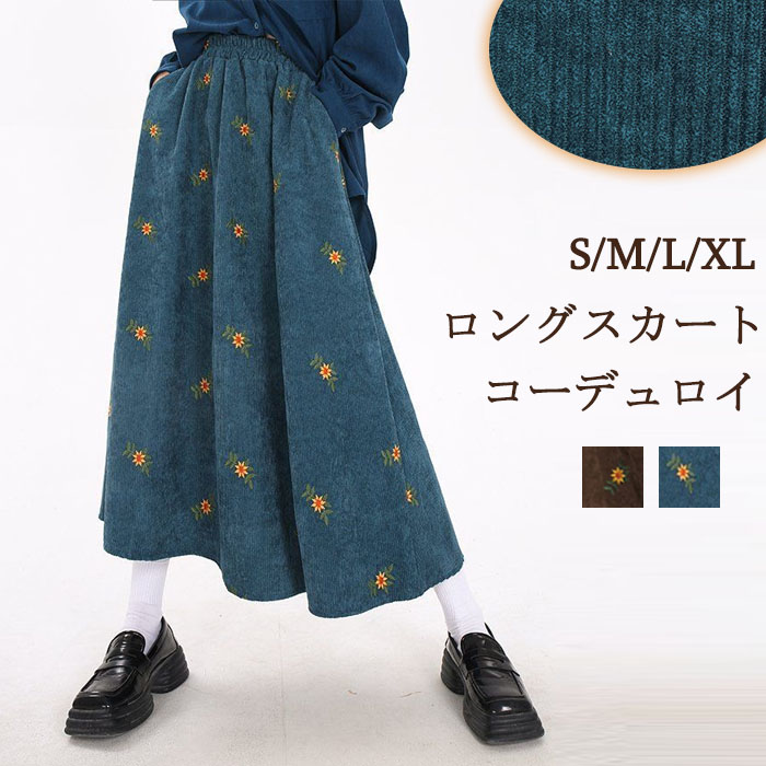 コーデュロイスカートロングスカートAライン花柄レディースギャザースカートハイウエストロング丈ミモレ丈ボリューム感刺繍クラシック着痩せ体型カバー可愛いおしゃれキレイ目春秋秋冬お出かけお呼ばれ森ガール風