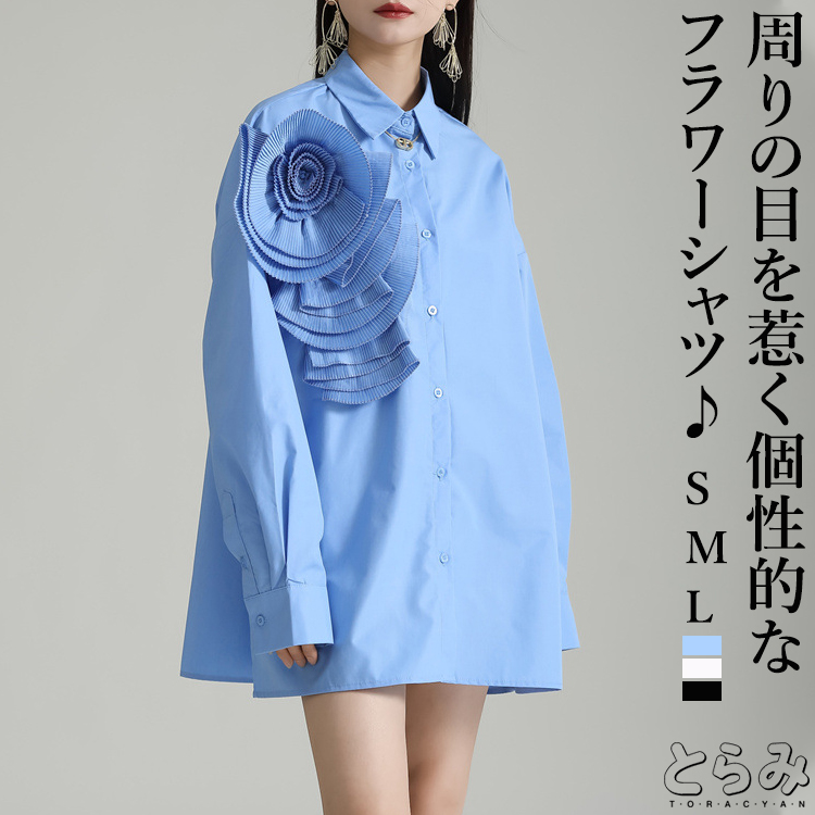 フラワーデザインシャツ シャツ レディース トップス ブラウス 長袖 フランス風 フラワーデザイン アシンメトリー 個性的 モード系 S M LLきれいめ ホワイト ブラ L