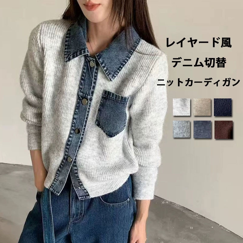 レイヤード風 デニム ニット カーディガン ドッキング 襟付き カジュアル 重ね着風 デニム切替 レディース 配色 ニットカーディガン 長袖 異素材 ジャケット ニットセーター 前開 切り替え