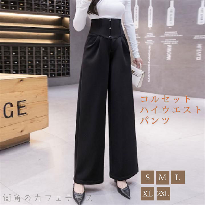 パンツ コルセット風 レディース ハイウエスト 春 秋 黒 ブラック 無地 エレガント きれいめ 20代 30代 40代 ガウチョパンツ ロング丈 十分丈 ロングパンツ ワイドレッグ オー ストレート