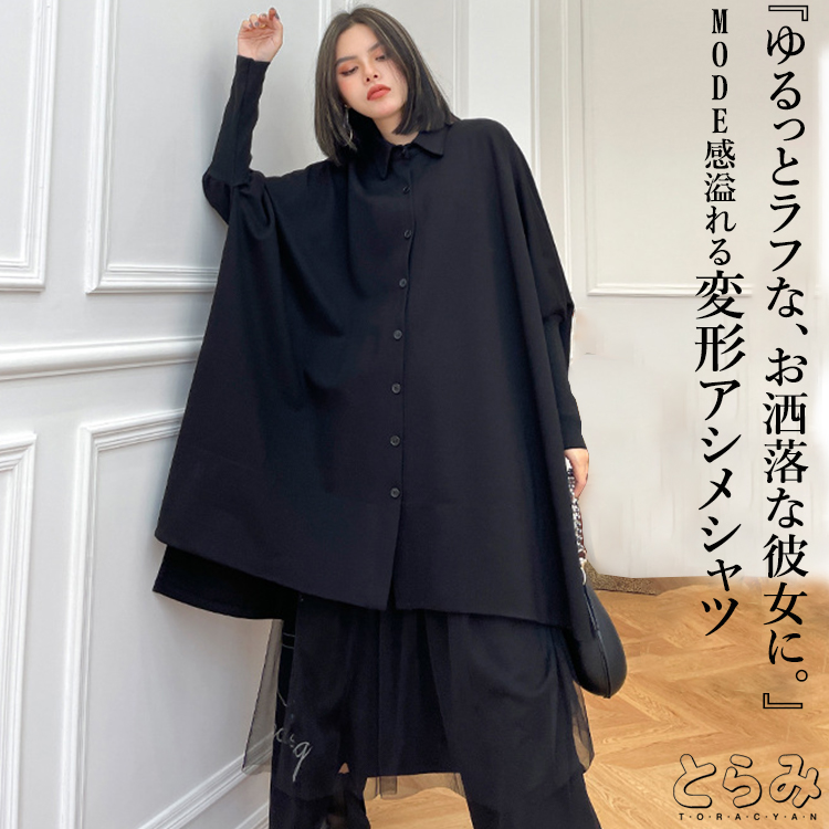 ロングシャツ レディース 長袖 襟付き シャツワンピース アシンメトリーヘムデザイン 斜めドレープ 前開き 羽織り 変形デザイン 個性的 メンズ ユニセックス モード系