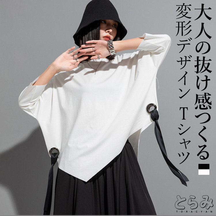 ヘムデザインTシャツ Tシャツ レディース 半袖 モード系 ドルマントップス トップス カットソー リングデザイン 前後差 レイヤード風裾変形 無地 個性的 夏 夏服 夏コーデ ユニセックスカジュアル