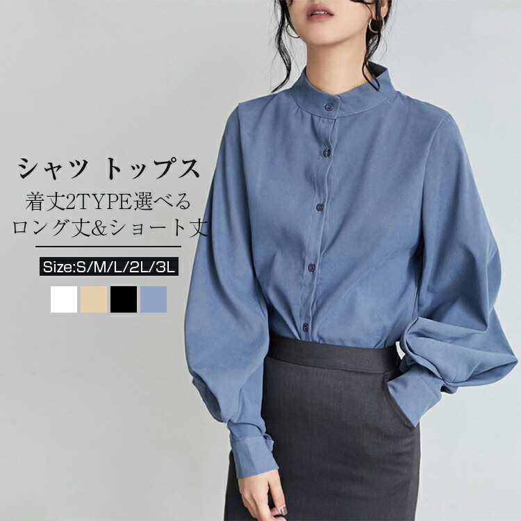 着丈2TYPE選べる シャツ ブラウス チュニック トップス レディース 長袖 立ち襟 春 秋 冬 ボリューム袖 ロング丈 ショート丈 シャツワンピース ロングシャツ ボタン コットン混 ゆっ 前開き