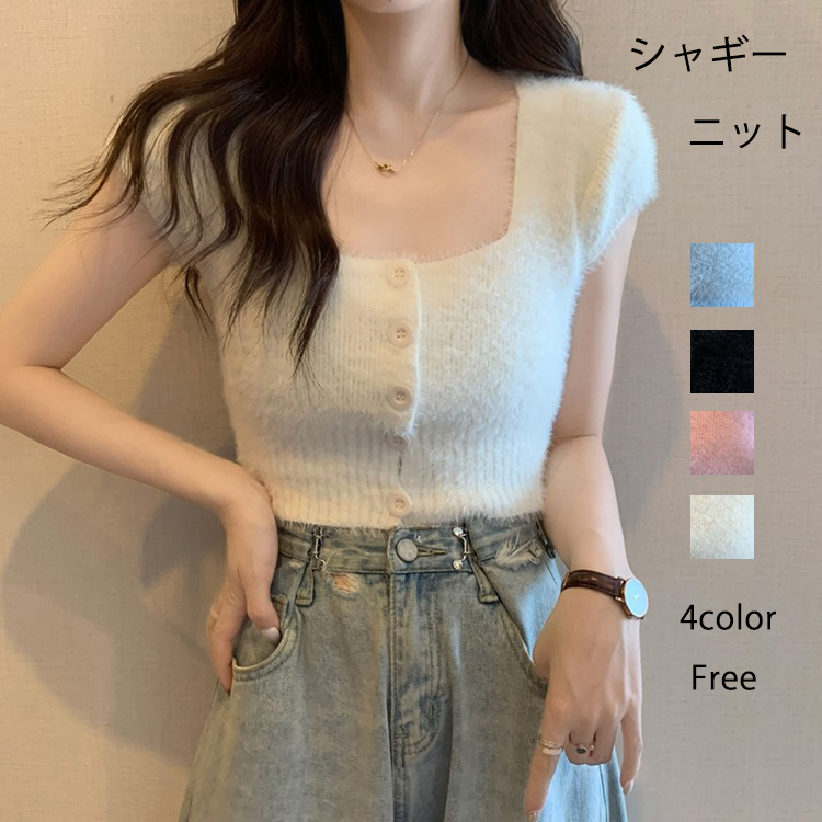 シャギー ニット 半袖 レディース 女性 トップス スクエアネック シンプル 上品 オフィス OL 通勤 カジュアル おしゃれ 婦人 夏 春 秋 プルオーバー 普段着 ホワイト 白 黒 きれ ブラック