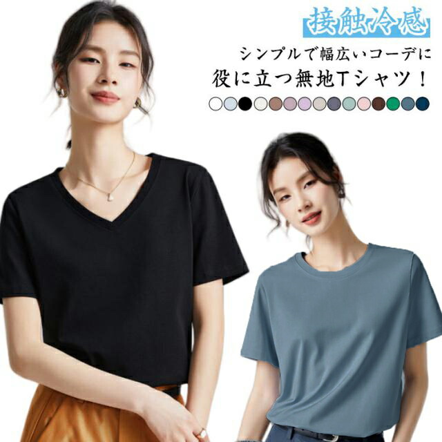 2枚セット 接触冷感 Tシャツ 半袖 レディース 汗じみ防止 涼感 tシャツ UVカット カットソー 薄手 春夏 涼しい Vネック クルーネック トップス シンプル 吸水速乾 カジュアル インナ 無地