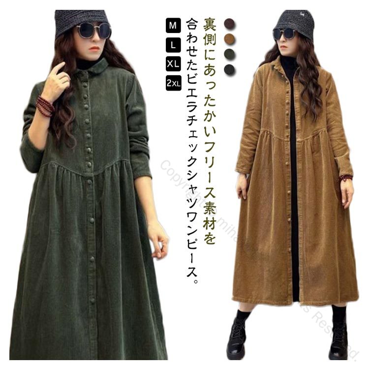 シャツワンピース 長袖 ロング丈 秋 大きいサイズ 秋冬 きれいめ ロングワンピース レディース 羽織り 裏起毛 コーデュロイ ワンピース マキシワンピース 体型カバー 暖かい ミモレ ゆっ あったか