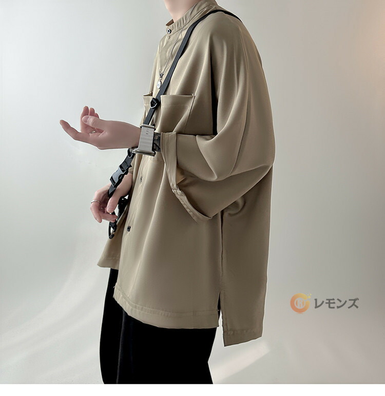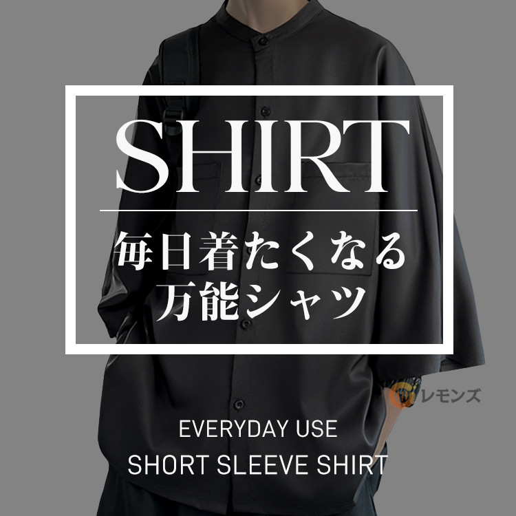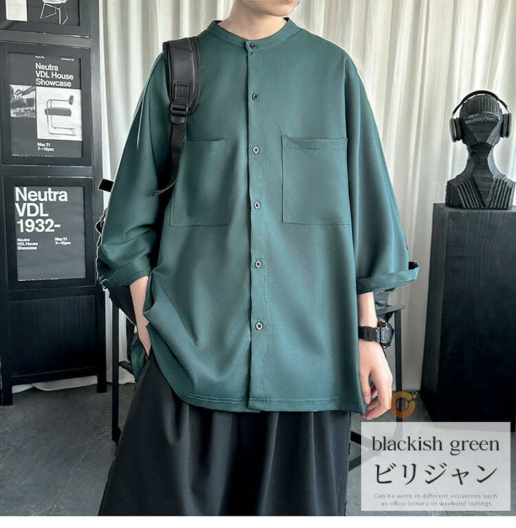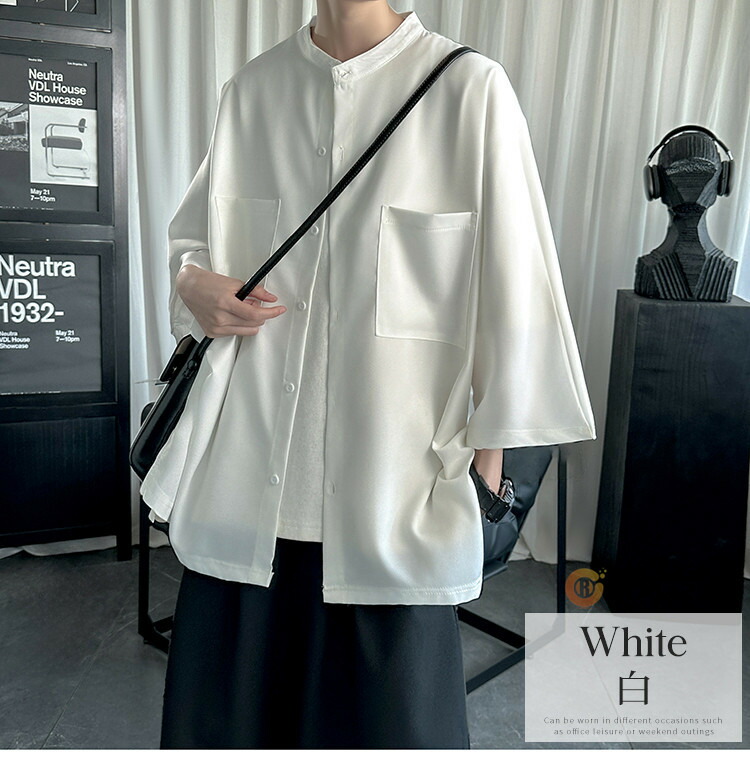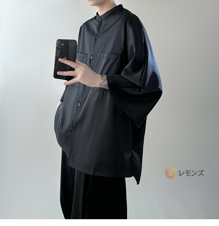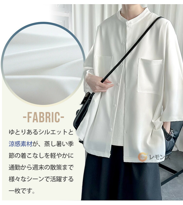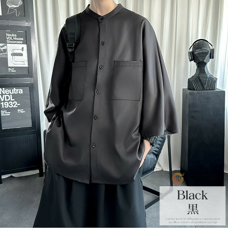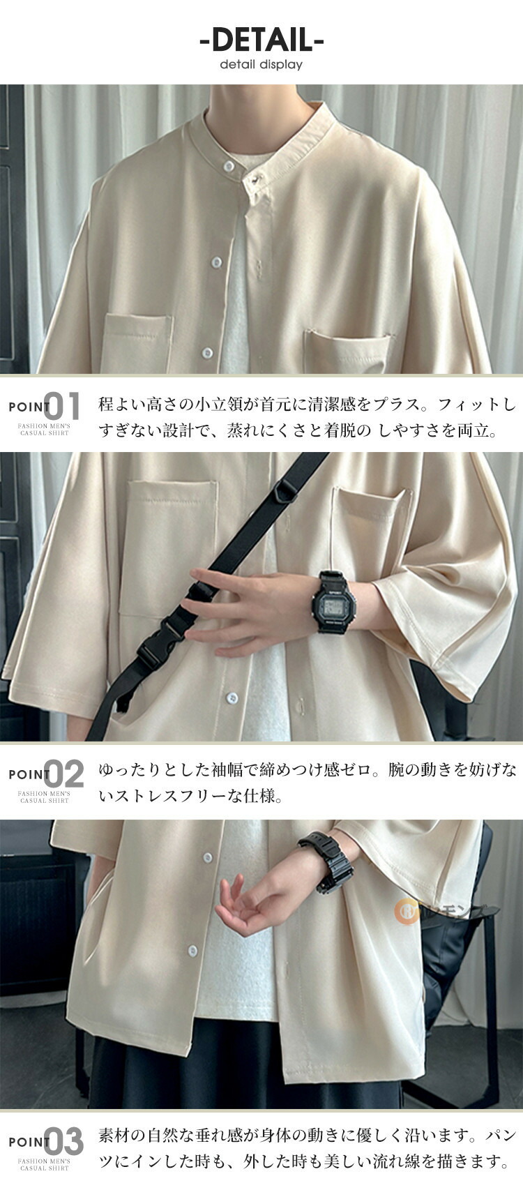 7分袖シャツ メンズ カジュアルシャツ 接触冷感 七分袖 五分袖 バンドカラー スタンドカラー シャツ オーバーサイズ カジュアル 襟無しシャツ ビッグシャツ トップス サーフ系 リ おしゃれ
