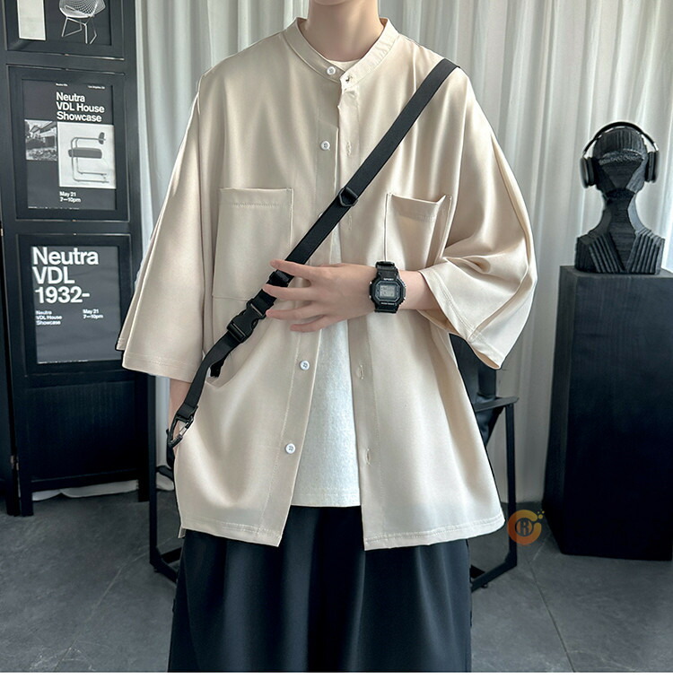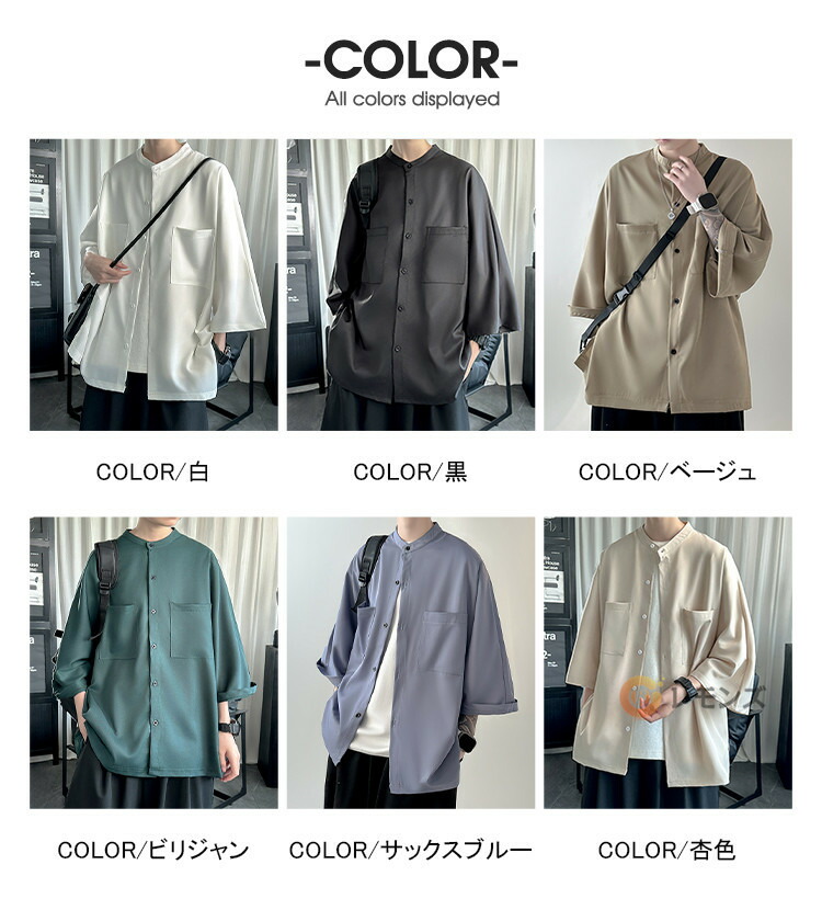 7分袖シャツ メズ カジュアルシャツ 七分袖 五分袖 バドカラー スタドカラー シャツ オーバーサイズ シャツ オーバーサイズ シャツ カジュアル 襟無しシャツ ビッグシャツ おしゃれ ッス サーフ系 リゾー 服 韓国 ファッショ 夏服 春服 父の日