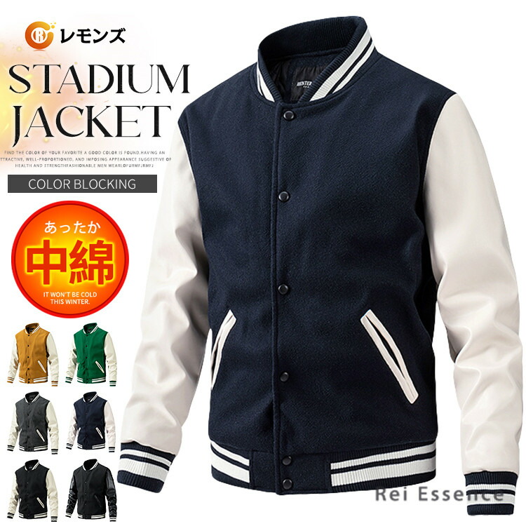 スタジャン メンズ メルトン ジャケット 中綿 ブルゾン バーシティジャケット 配色 切り替え 野球服 あったか アウター ライン入り メンズファッション 秋服 冬服 厚手 防寒着 防 秋冬
