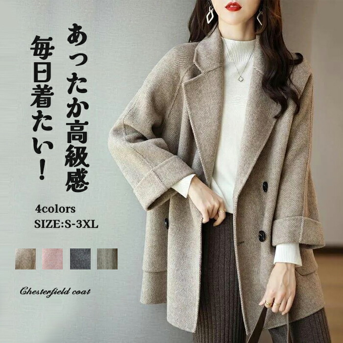 チェスターコート レディース 秋 冬 ショートコート ダブル テーラードジャケット ポケット付き アウター 羽織 ミドル丈コート 防寒 暖かい 厚手 上品 通勤 コート 大きいサイズ