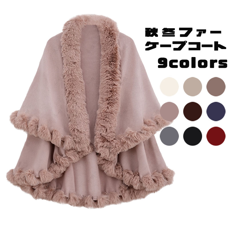 9色 ケープコート レディース ファー付き ポンチョコート ファーコート 肩掛け ケープ 秋 冬 羽織 アウター 赤 黒 紺 茶色 白 灰色 グレー フェイクファー カシミヤタッチ マント