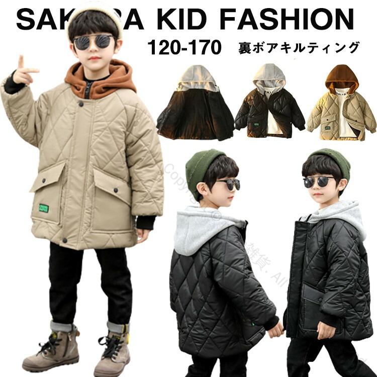 モッズコート キッズ 子供コート 長袖 ロングコート キルティング ジャケット フード付き 裏ボア ゆったり 防寒 秋冬用 男の子 120から170cm対応 アウター 羽織り暖かい ジュニア