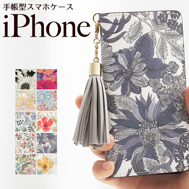 タッセル付 リバティ プリント コットン スマホカバー 花柄 フラワー 綿 本革 オリジナル お洒落 フェミニン かわいい シンプル レザー カード ポケット ホルダー 収納 ほぼ 全機種対応