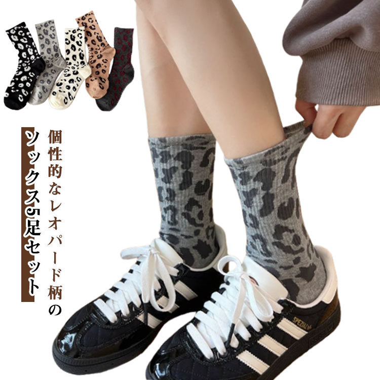 5足セット 靴下 レオパード柄 ヒョウ柄 レディース ソックス クルー丈 カジュアル リブソックス くつ下 おしゃれ 春 秋 冬 スニーカーソックス 通勤 通学 柔らかい ユニーク 個性的 かわいい