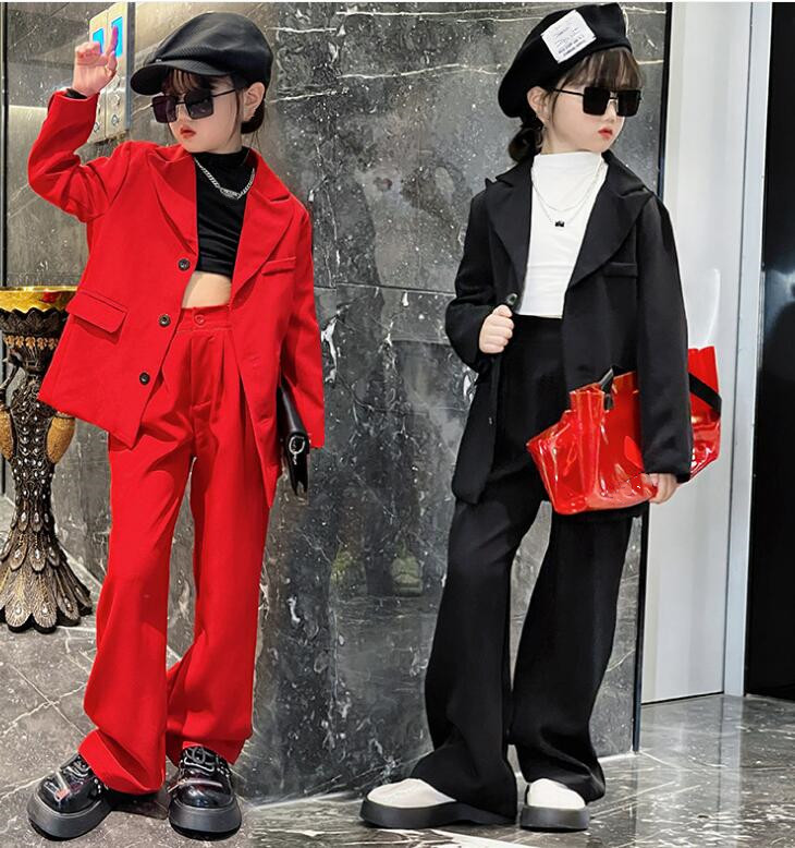 ダンス衣装キッズヒップホップ 赤 黒 セットアップ 女の子 上下セット 2点セット 長袖 ダンススーツ へそ出し ジャズダンス 衣装 かっこいいスーツ 子供服 長ズボン レッド フォーマル ジャケット